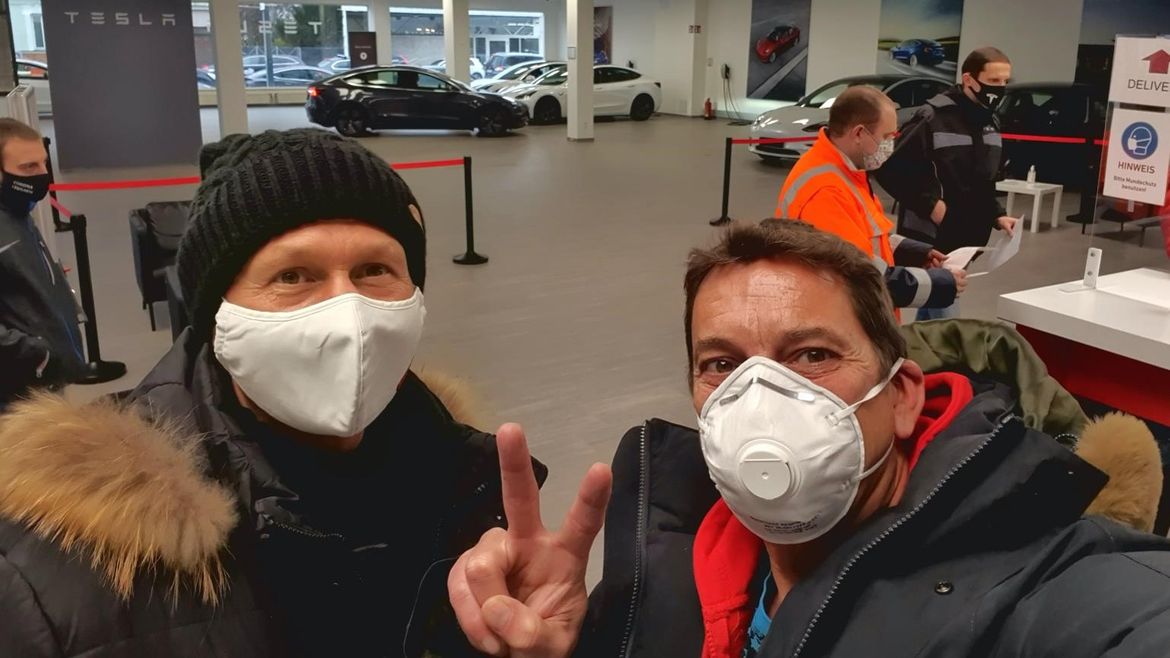 Bei der Anmeldung könne wir trotz Maske unser erfreutes Grinsen vermutlich nicht ganz verbergen. Unser Tesla wird für die Übergabe vorbereitet. Corona bedingt wird man gebeten Abstand zu halten, was unter normalen Umständen nicht so wäre. Desinfektionsmittel steht an allen Ecken und Enden bereit.